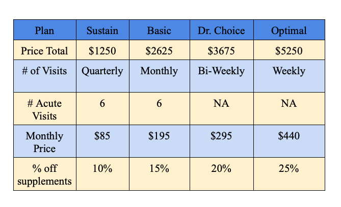 Patient’s whose health concerns require a monthly, dedicated visit with the doctor plus an additional monthly naturopathic treatment. Visits can be scheduled as needed, not to exceed 25 total (acute visits not included in total). Any combination of visits and treatments over 25 will be charged at the plan rate.